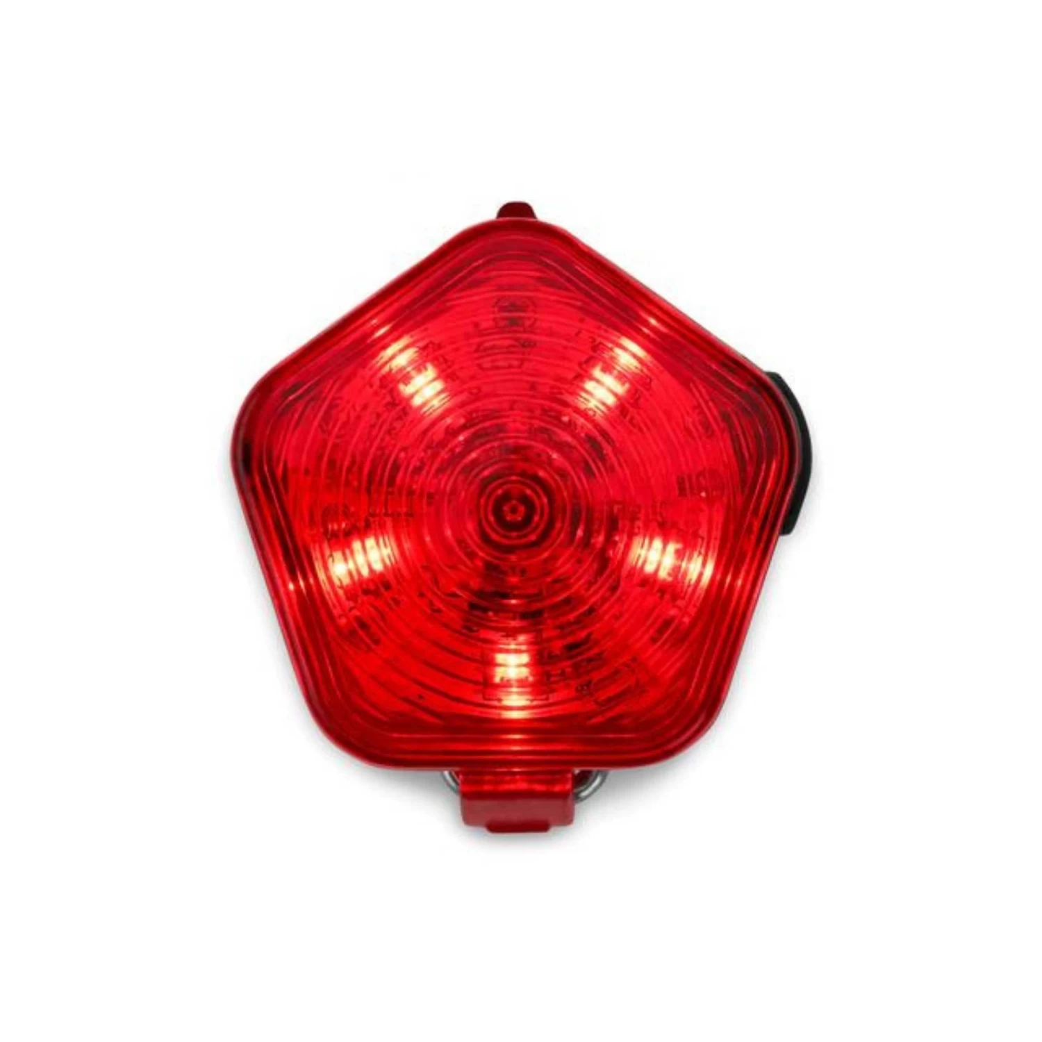 Rapid flash and audible indications when battery needs to be recharged LED lights emit through translucent red shell
