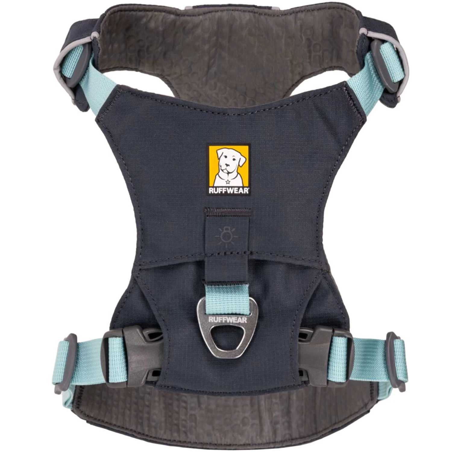 - Two leash connection points: Aluminum V-ring on back and reinforced webbing loop on chest